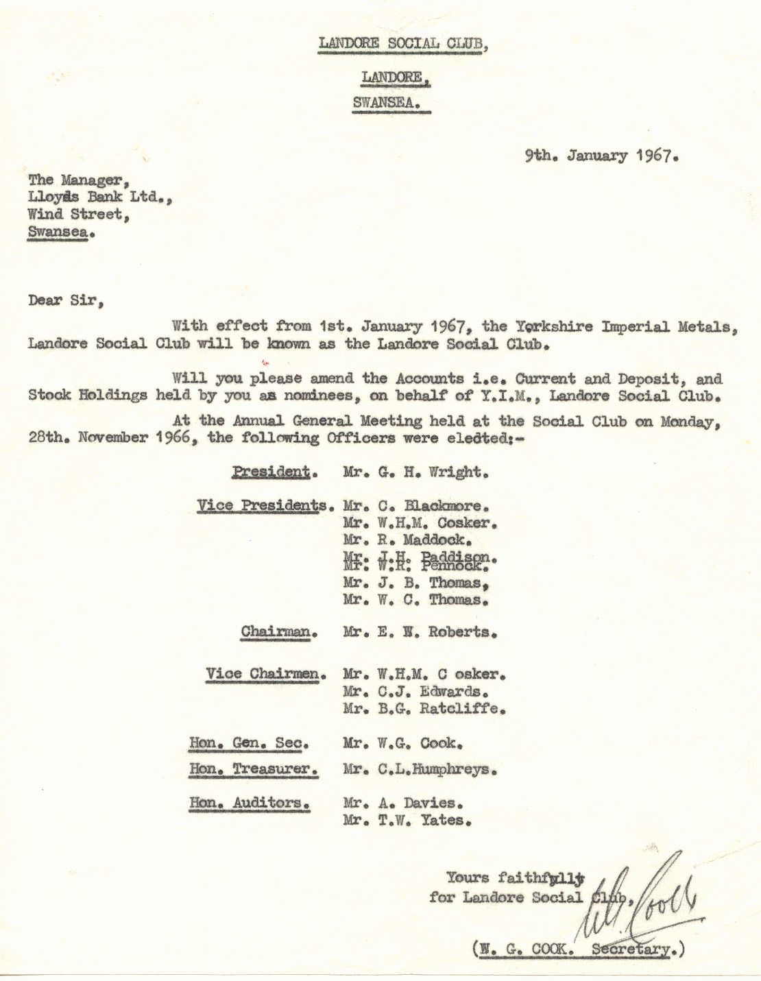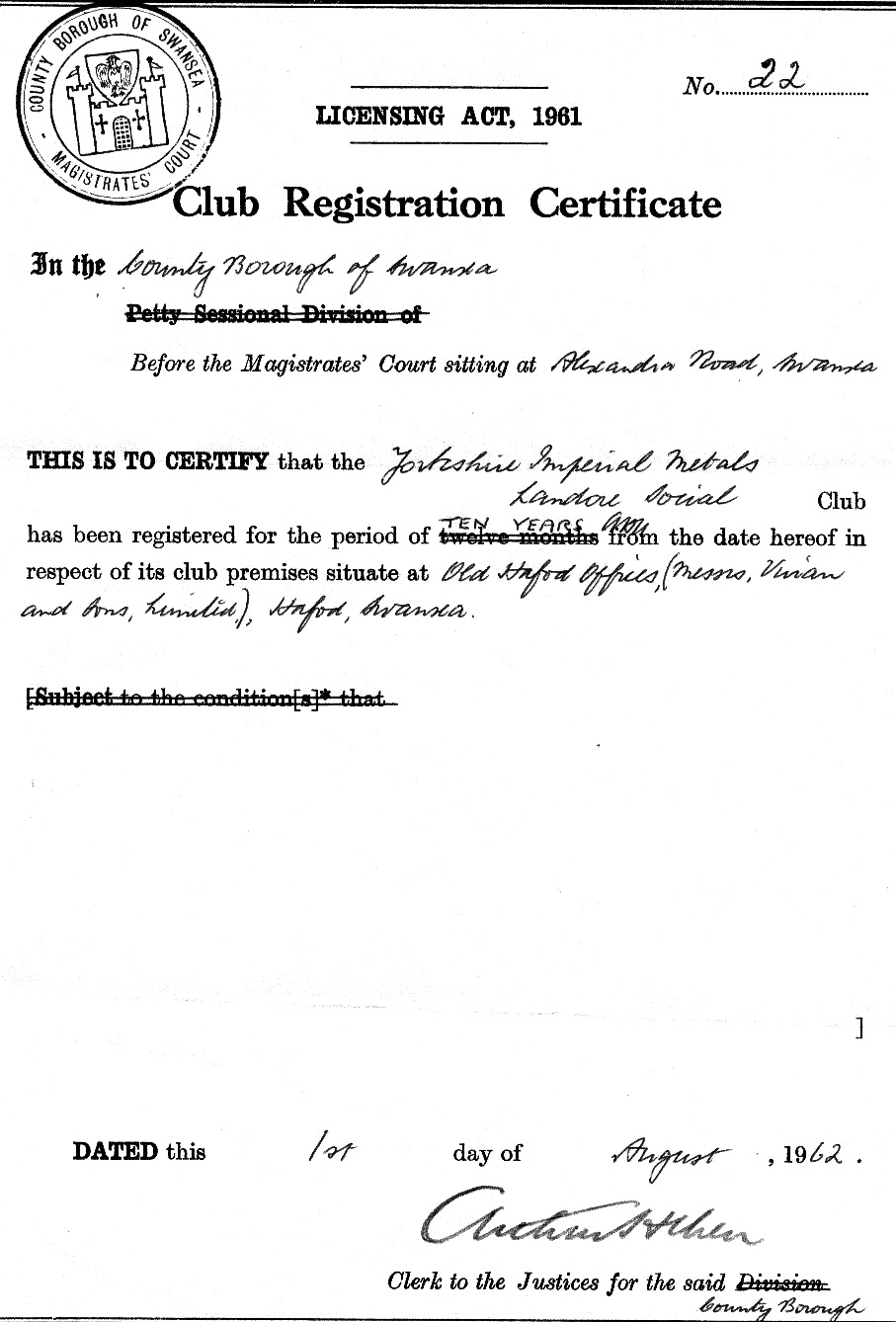 The History of Landore Social ClubComments by Ivor Williams - December 1999Having worked in Landore Copper works since February 1960 and a Club Committee Member for most of that period, I felt that it was necessary to compile the History of the Club with available records. During this period I collected memorabilia from the Works and Social Club, which have helped me to display documents to substantiate historical records. The purpose being to portray the origin, developing changes, growth and culture of the Club since 1934. In August 1999 I requested and received permission from the Club Executive Management Committee to allow me access to all Club records, for which I am very appreciative. I feel that it is important to record this information, to allow the older members, while we still remember most of the Club history, to contribute to this magazine, so that hopefully it will be ongoing and updated periodically. I intend to print my first draft copy before the Millennium 2000 and then to frequently update with new editions as I receive more information, to identify different copies I will title them the Date and Edition number. I invite every person, who is able make a contribution, to contact me at Landore Social Club where I will be pleased add to these records. I have taken most of the information from past documents, but at this stage, some information is limited and corrections may be necessary. If sections are too personal or in bad taste, then these can be removed. I have deliberately avoided Mr. & Mrs. titles, preferring the more informative Christian names. AcknowledgementsI would like to take this opportunity to thank everyone who helped me to compile these records, especially Mr. Ron Jones who so kindly photographed pictures and cups with his digital camera. Second Edition 25th January 2000 - Table of Contents