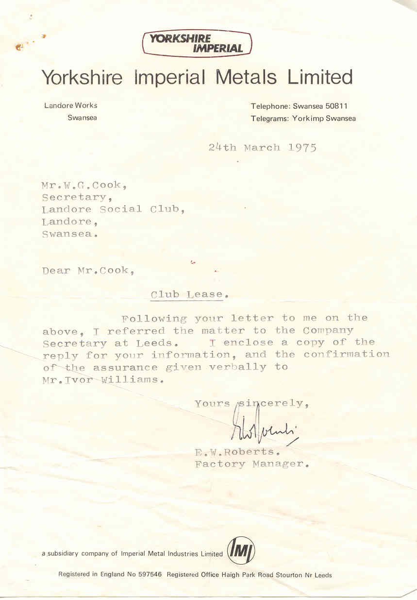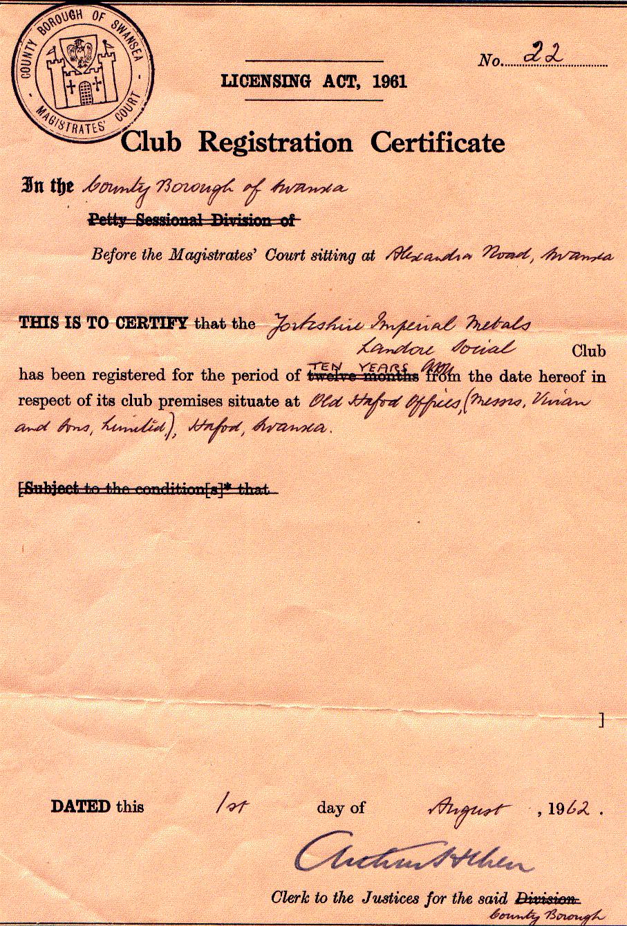 The History of Landore Social ClubComments by Ivor Williams - December 1999Having worked in Landore Copper works since February 1960 and a Club Committee Member for most of that period, I felt that it was necessary to compile the History of the Club with available records. During this period I collected memorabilia from the Works and Social Club, which have helped me to display documents to substantiate historical records. The purpose being to portray the origin, developing changes, growth and culture of the Club since 1934. In August 1999 I requested and received permission from the Club Executive Management Committee to allow me access to all Club records, for which I am very appreciative. I feel that it is important to record this information, to allow the older members, while we still remember most of the Club history, to contribute to this magazine, so that hopefully it will be ongoing and updated periodically. I intend to print my first draft copy before the Millennium 2000 and then to frequently update with new editions as I receive more information, to identify different copies I will title them the Date and Edition number. I invite every person, who is able make a contribution, to contact me at Landore Social Club where I will be pleased add to these records. I have taken most of the information from past documents, but at this stage, some information is limited and corrections may be necessary. If sections are too personal or in bad taste, then these can be removed. I have deliberately avoided Mr. & Mrs. titles, preferring the more informative Christian names. AcknowledgementsI would like to take this opportunity to thank everyone who helped me to compile these records, especially Mr. Ron Jones who so kindly photographed pictures and cups with his digital camera. Second Edition 25th January 2000 - Table of Contents